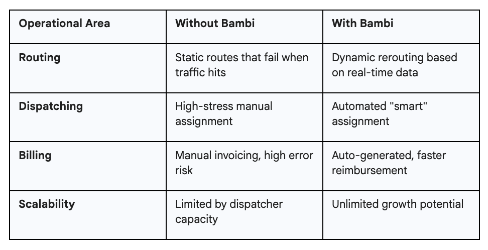 Bambi introduces "Run Bambi Run", a one-click AI-powered scheduler that takes the hassle out of fleet scheduling. Whether managing 10 trips or 10,000, dispatchers can instantly optimize schedules with ease. The platform also offers real-time dispatching, automatically adjusting trip assignments when drivers call out, passengers no-show, or last-minute changes occur.