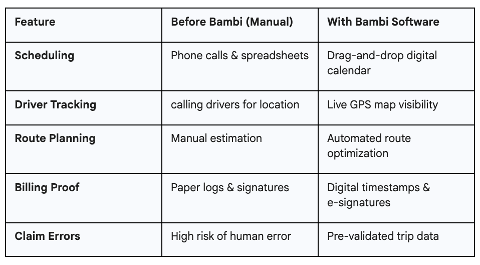 "Changing to Bambi it's the most impactful thing I did for my NEMT Business. Bambi's saving my staff hours of daily work and our team has much more time to focus on improvements."
